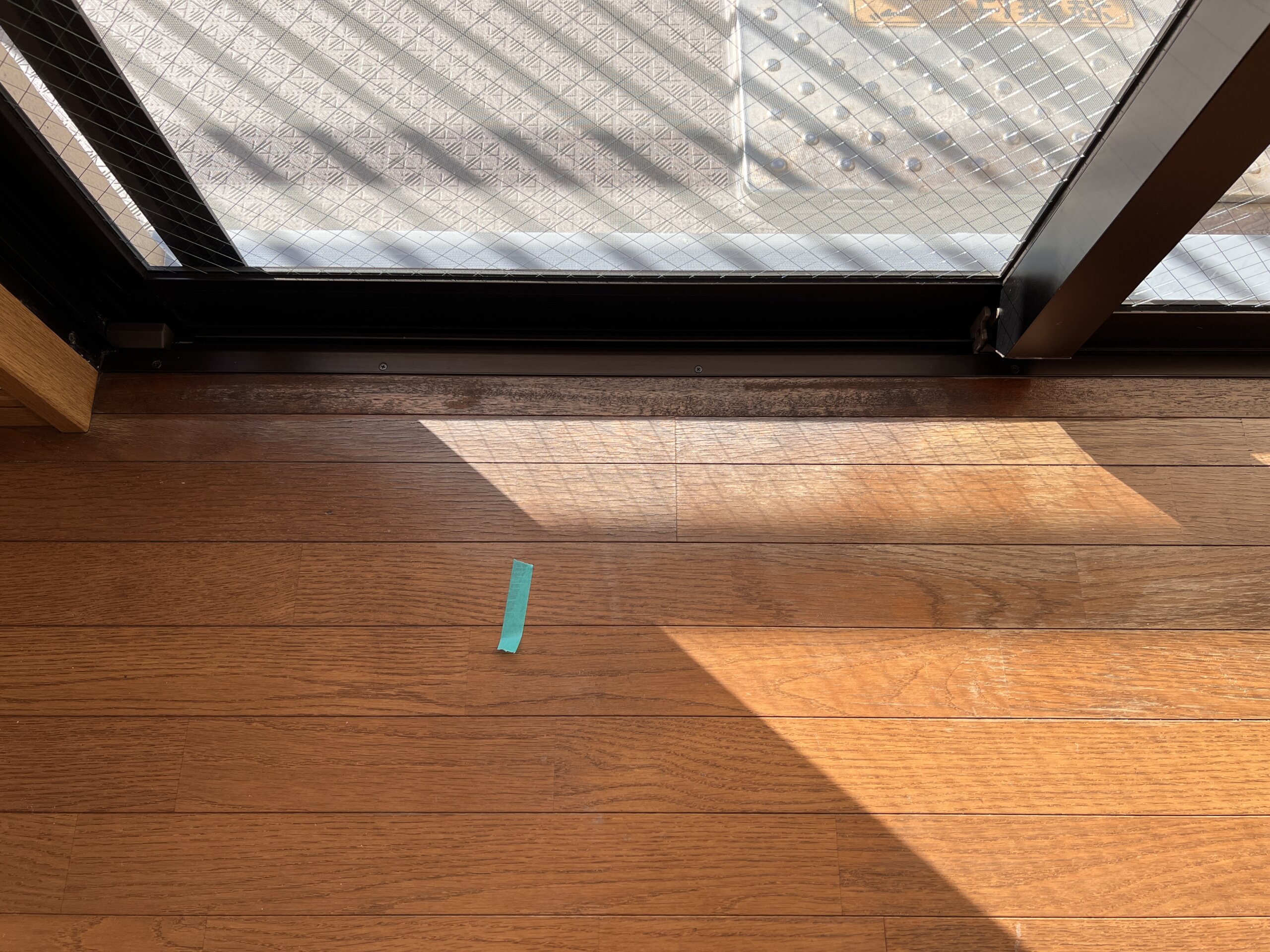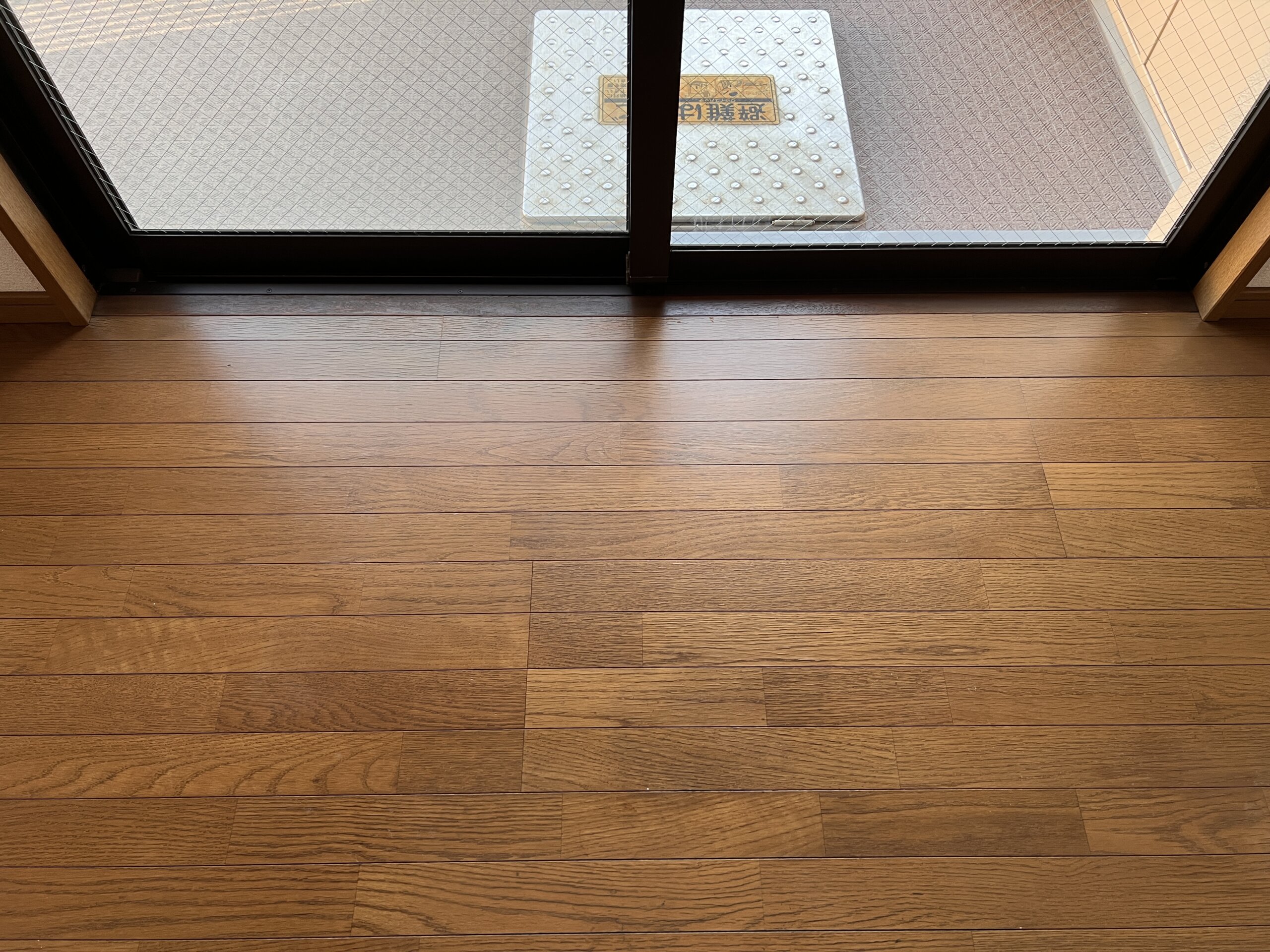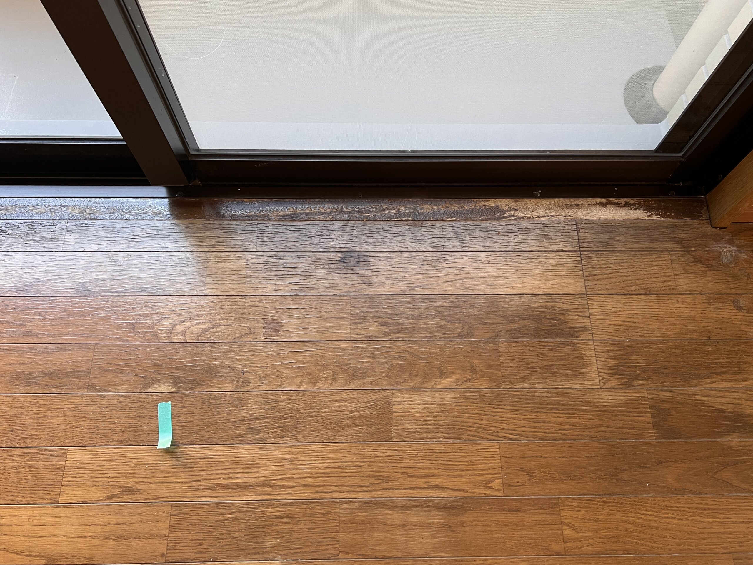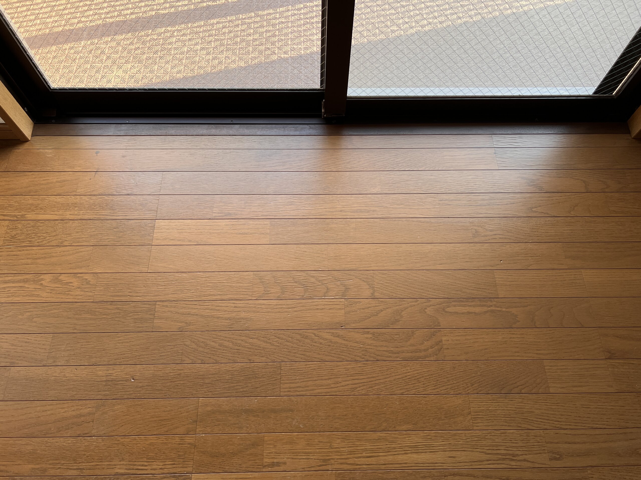 写真を見るだけでもサッシ前のフローリングがガサガサになっているのが分かるかと思いますが、実際に手で触るとささくれが手に刺さりそうなほど傷んでいました。